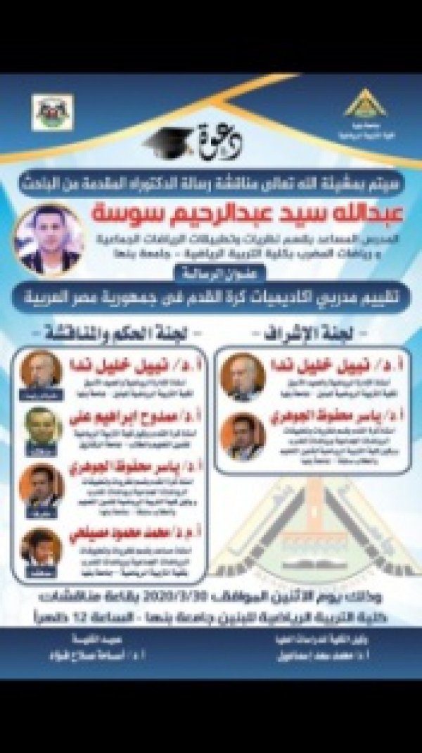 There is a PhD dissertation of the researcher/ Abd-Allah Sayed Abd EL-Reheim Sosa that will be held in the faculty of physical education on Monday, 30-3-2020. The faculty wishes the candidate success and prosperity.
