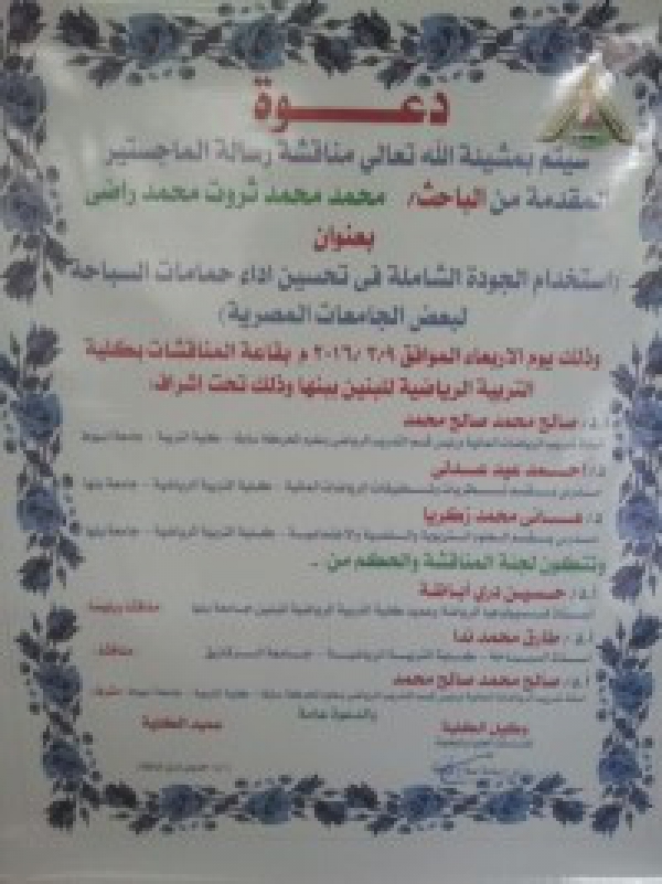 Master thesis of the Researcher\ Mohamed Mohamed Tharwat Mohamed Rady was discussed on Thursday; 21\3\2016.The Discussion committee includes Prof.Dr.Saleh Mohamed Saleh, Prof.Dr. Hany Mohamed Zakarya, Prof.Dr. Hussein Dory Abaza and Prof.Dr.Yasser Mahfouz El Gohary.