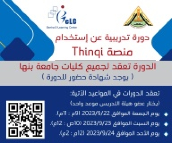The E-learning center announces that there will be, under the auspices of prof.Dr. Nasser EL-Gizaway, the University president, a training course for the faculties’ members on how to use Thinqi application. For those who would like to register and attend the training course, kindly visit the following link: